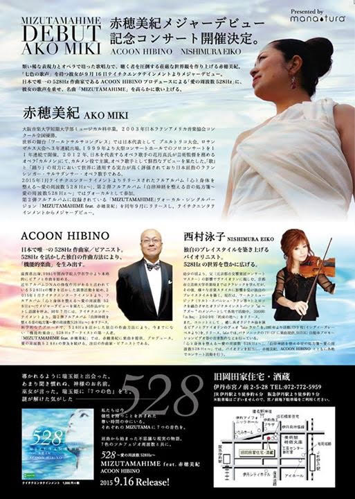 赤穂美紀メジャーデビュー記念コンサート Posted 2015年9月8日 by wpmaster 導かれるように瑞玉姫と出会った。 あまり聞き慣れぬ、神様のお名前。 巫女が言った。 瑞玉姫に「7つの色」をと。 謎が解けた気がした・・・・・ 私たちは今、個性を持つことを許された尊い時間の中にいる。 それぞれのMIZUTAMAに7つの音色を。 沼島から始まった不思議な現実の物語。 7色のソルフェジオ周波数と共に。